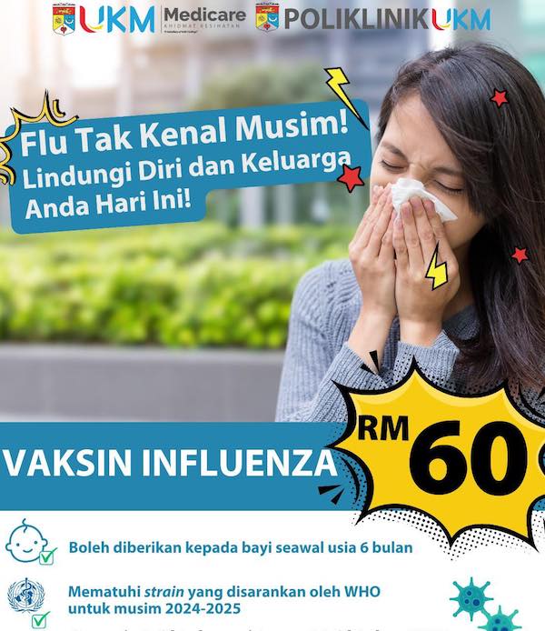 Promosi Vaksin Influenza RM60 ini sehingga 30 November 2025 di Poliklinik UKM Bandar Baru Bangi, Poliklinik UKM Bangi Avenue, Poliklinik UKM Bandar Sri Permaisuri, Poliklinik UKM Kota Warisan, Poliklinik UKM Nilai Impian & Poliklinik UKM Setia Alam.